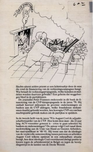 Het meest markante feit is dat de aartsbisschop en verscheidene bisschoppen zelf gelden laten overmaken op de CVP-rekening. Men kan moeilijk aan de vraag ontkomen of de godsdienstige gevoelens van de gelovigen hier niet worden misbruikt voor politieke doeleinden die geen uitstaans hebben met de leer van Jezus Christus. De bisschoppen worden geacht de geestelijke leiders te zijn van de hele kerkgemeenschap. In die gemeenschap treft men vandaag een toenemend aantal personen aan die resoluut optreden voor een strijdende sociale inzet aan de kant van de onderdrukten. Hoe verantwoorden de bisschoppen dat zij kerkelijke gelden doen afvloeien naar een partij die een ekonomische orde in stand houdt waartegen steeds meer gelovigen verzet aantekenen? De tienduizenden gelovige werklozen in dit land die hun mager inkomen gestadig door nieuwe regeringsdiktaten zien aanvreten, weten aan wiens kant de CVP zich opstelt. De honderdduizenden kristenen die in Centraal-Amerika de zijde van het revolutionair verzet kiezen, weten dat de kristen-demokraat Napoleon Duarte in El Salvador aan de andere kant van de barrikade vecht. Zij weten allicht niet dat onze Belgische CVP pal achter Duarte staat. Men neemt met enige verbazing kennis van de grote sommen die door de Katolieke Universiteit van Leuven naar de CVP-verkiezingsspaarpot overgesast worden. Zeven miljoen frank over een periode van tien jaar is niet weinig: bijna de helft van alb fondsen uit de direkte omgeving van de katolieke kerk die wij konden registreren. De aanwezigheid van August Cool in de be-heerraad van de KUL heeft allicht het wegvloeien van universitaire gelden naar de CVP-kas vergemakkelijkt. Het blijft een vraag welke deskundige hand deze zeven miljoen heeft weten weg te moffelen in de boekhouding van de Leuvense Tempel der Wetenschap. Evenveel verwondering wekt de aanwezigheid van het kato-liek onderwijs op de lijst van steungevers voor de CVP-propaganda. Hoeveel leraars en leraressen zijn reeds op straat gezet omdat zij standpunten innamen die strijdig werden genoemd met de katolieke opvattingen zoals die door de inrichtende machten gehuldigd worden? En nu komt vast te staan dat diezelfde inrichtende machten vier miljoen op tafel legden om de politieke standpunten van de CVP te promoten. De kontrole over het grootste deel van het onderwijs door privé-personen, te weten de gezagsdragers van de kerk, is een erfenis uit de middeleeuwen. Achtenvijftig procent van de schoolgaande jeugd komt terecht in een onderwij snet dat privé-bezit is van een dozijn gemijterde prinsen. Men vermijdt hier best het woord geestelijke leiders want met godsdienst heeft dit weinig te maken. Zij die hun godsdienst beleven als een getuigenis, klampen zich niet vast aan de feodaliteit, zij bewegen zich zonder problemen binnen de demokratie. In één enkei, demokratisch georganizeerd onderwij snet zouden katolieke leraars en leerlingen getuigenis afleggen van hun godsdienstbeleving en dit zowel tegenover gelovigen als atheïsten. Een onderwijsnet in de privé-handen van de bisschoppen heeft weinig met godsdienst maar alles met politieke macht en politieke beïnvloeding te maken. Dat is de betekenis van de schaamteloze geste waarmee de overheid van het katoliek onderwijs vier miljoen neertelt voor de propaganda-afdeling van de CVP. Dat de onderwijsinstellingen in sommige gevallen vrijwel verplicht worden geld op tafel te leggen voor de CVP-partijpropa-ganda, moge ook blijken uit volgende brief. Het Kortrijkse CVP-bestuur machtigt zich daarin het recht toe de scholen een schatting ten bedrage van 2 a 3 frank per leerling op te leggen. En dit gebeurt met de steun van de kerkelijke overheid! Op 27 april 1966 schreef het bestuur van de Kortrijkse CVP-afdeling deze brief aan de direkties van de katolieke scholen in het arrondissement: