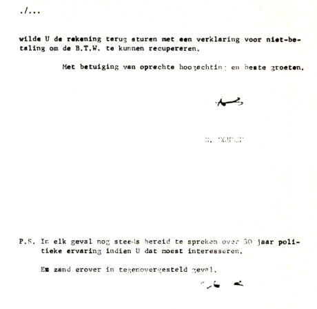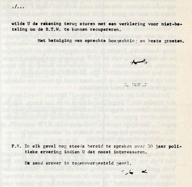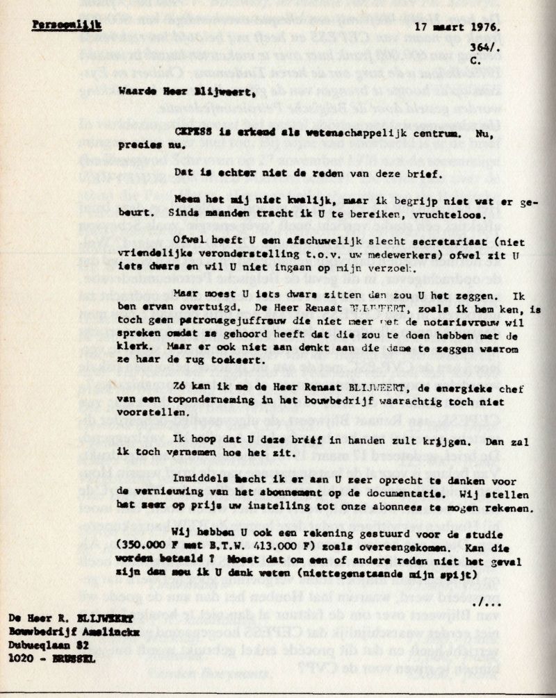 Ter beschikking van voorzitter Martens: 87.000, - frankTer beschikking van voorzitter Nothomb: 88.000, - frank Totaal: 900.000,-frank De heer Hatry heeft mij een cheque overhandigd van 300.000 frank op naam van CEPESS en heeft mij beloofd het resterende bedrag van 600.000 frank later over te maken ten laatste in januari 1979. Ik laat u de zorg om de heren Tindemans, Chabert en Eyskens op de hoogte te brengen van de giften die hen ter beschikking worden gesteld door de Belgische Petroleumfederatie. Uw toegenegen, (getekend) R. SCHEYVEN Het kan zijn dat CEPESS in de maanden volgend op deze brief effektief een studie verricht heeft 'over energie' zoals Scheyven schrijft. Maar wanneer is zo'n studie 125.000 frank waard? Welke normen worden daarvoor gehanteerd en is het niet vreemd dat de opdrachtgever, in dit geval de Belgische Petroleumfederatie, zonder in kontakt te zijn geweest met degene die de opdracht zal uitvoeren, in casu CEPESS, lukraak een prijs bepaalt? Zou men daaruit kunnen afleiden dat dergelijke studies pro forma verricht worden en dat het uiteindelijk erom gaat financiële steun te verlenen aan de CVP-PSC met de aan dit procédé gebonden fiskale voordelen voor de ondernemingen of de patroonsorganizaties? In dat kader is de brief van Robert Houben, direkteur van CEPESS, aan Renaat Blijweert, de afgevaardigd-beheerder direkteur-generaal van het bouwbedrijf Amelinckx, veelzeggend. De brief, gedateerd 17 maart 1976, is hierbij integraal afgedrukt. Van belang is vooral de laatste passage van de brief waarin Houben duidelijk maakt dat hij graag zou hebben dat Blijweert 'de studie' betaalt. Mocht Blijweert dat niet willen doen, dan moet hij Houben verwittigen zodat deze laatste de BTW kan rekupereren. Dat is een hoogst eigenaardige manier van zaken-doen. Als de studie werkelijk verricht is, als CEPESS werkelijk recht heeft op bijna een half miljoen frank vergoeding voor het werk dat gepresteerd werd, waarom laat Houben het dan aan de goede wil van Blijweert over om de faktuur al dan niet te betalen? Is het niet eerder waarschijnlijk dat CEPESS hoegenaamd géén studie verricht heeft en dat dit procédé enkel gebruikt wordt om geld binnen te rijven voor de CVP?