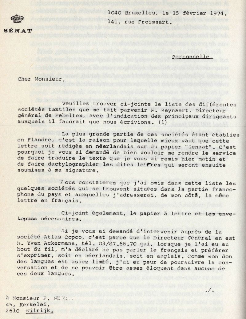 van 23.771.000 frank Rekapitulatie - In kas op 31 december 1973: 8.402.143 frank Deze som is als volgt verdeeld: 9.693.788 frank Uit dit overzicht blijkt dat de steun die bij de verkiezingen opgehaald wordt, ook moet dienen om de werking van de partij nadien gedeeltelijk te financieren. Zo hoort bijvoorbeeld de betaling van de CVP-voorzitter thuis onder wat Raymond Scheyven hier noemt 'het konfidentieel budget'. De banken en de holdings nemen het leeuwenaandeel van de inkomsten tijdens verkiezingsperiodes voor hun rekening. Op korte tijd zoveel mogelijk binnenrijven - Inhoud Kiescampagnes zijn erg drukke periodes voor een schatbewaarder. Scheyven schakelde daarom een aantal tussenpersonen in. De eerste tussenpersoon was uiteraard zijn Vlaamse adjunkt. Daarnaast kon Scheyven rekenen op de schatbewaarder van het ACW, Hubert Detremmerie. Detremmerie belastte zich gewoonlijk met de steun die vanuit de spaarkassen moest komen. Hij sprak de leiders aan van An-Hyp en Ippa. Gaston Geens zorgde voor de financiële steun vanuit de Katolieke Universiteit van Leuven. Charlie De Pauw, de big boss van de Brusselse bouwwereld sprong Scheyven bij om steun los te krijgen van bouwmaatschappijen. Om de staalbaron en miljardair Albert Frère te benaderen, had Scheyven twee kontaktpersonen. De eerste, in 1974, was Maurice Orban. Orban was voordien minister geweest. In de beginjaren '70 was hij lid van de fascistische Ligue Internationale de la Liberté. In '77 overleed Maurice Orban. Scheyven zette daarop een tweede tussenpersoon in om Albert Frère tot fikse steun aan te zetten. Dat was graaf Yves du Monceau de Bergendal, burgemeester in Ottignies en PSC-senator. De graaf was in die periode beheerder van onder meer Cobepa waar ook Albert Frère beheerder van was en nog steeds is. De heren kennen elkaar dus. Ondanks het delegeren van vele taken, moest Scheyven zelf toch het meeste werk verzetten. Om de lezer een beeld te geven van de manier waarop Scheyven tewerk ging, is hierbij een drie bladzijden lange brief afgedrukt. Scheyven richtte deze brief op 15 februari 1974 aan zijn adjunkt Fernand Nédée. In vertaling luidt de brief als volgt: troonsorganizatie in de textielsektor, de auteurs)w opgesteld met vermelding van de voornaamste bedrijfsleiders waar wij naar moeten schrijven. Het overgrote deel van deze ondernemingen is in Vlaanderen gevestigd. Dat is de reden waarom deze brief beter in het Nederlands zou opgesteld worden op briefpapier van de Senaat. Ik zou u daarom willen vragen mij van dienst te zijn door de tekst die ik u gisterenmorgen gaf te laten vertalen en de vernoemde brieven te laten typen en mij ter ondertekening voor te leggen. U zal merken dat ik in deze lijst de enkele ondernemingen weggelaten heb die zich in het franstalige landsgedeelte bevinden en aan wie ik, van mijn kant, dezelfde briefin het Frans zal richten. Hierbij eveneens het noodzakelijke briefpapier en de briefomslagen. Ik heb u gevraagd tussen te komen bij de onderneming Atlas Copco omdat de direkteur-generaal de heer Yvan Ackermans is, tel. 03/87.68.70. Toen ik hem aan de lijn had, verklaarde hij geen Frans te spreken en er de voorkeur aan te geven zich in het Nederlands of in het Engels uit te drukken. Daar mijn talenkennis nogal beperkt is, had ik schrik de konversatie verder te zetten en niet voldoende welsprekend te zijn in één van die twee talen. Sinds gisterenmorgen heb ik goed nieuws: - A.G. vraagt fakturen voor een bedrag van 150.000 frank. Ik heb daarentegen ook slecht nieuws, heel slecht nieuws: - de firma Delens beperkt zijn bijdrage tot 300.000 frank tegen één