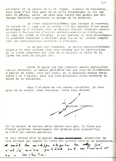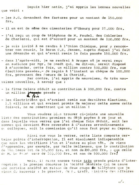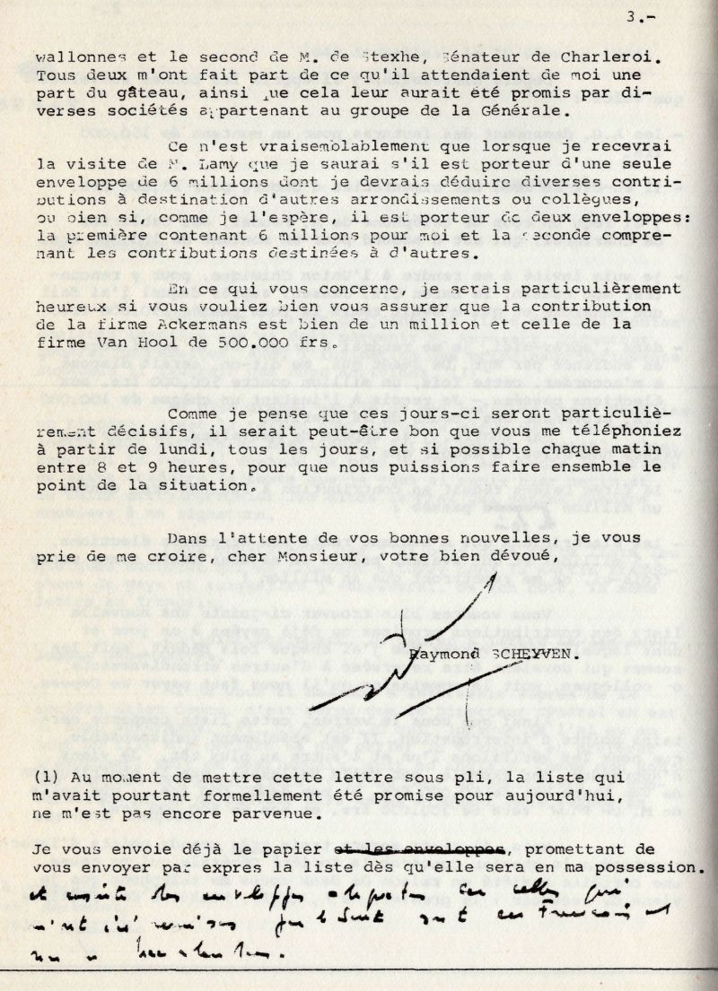 miljoen de vorige keer. Wil ook in bijgaande een nieuwe lijst vinden van beloofde bijdragen of van bijdragen die reeds betaald zijn. U zal merken dat ik telkens de bedragen afgetrokken heb die of aan andere arrondissementen, of aan kollega's moeten gestort worden alsook de provisie die aan CEPESS moet betaald worden. U zal ook merken dat op de lijst vraagtekens staan bij sommige namen. Het is absoluut noodzakelijk dat wij een en ander zo snel mogelijk verifiëren. Ik verneem bijvoorbeeld van juffrouw Hellemans (administratief direkteur van de PSC, de auteurs) dat de bijdrage van Van Laere 50.000 frank en niet 200.000 frank zal zijn; en deze van de de heer De Pauw 300.000 frank en niet 500.000 frank.' Maar er blijven nog drie heel grote vraagtekens: het eerste gaat over de Société Générale. Ik ben daarover toch wel bezorgd omdat ik twee telefoontjes gekregen heb. Het eerste telefoontje was van de heer Grafé, minister van Waalse Aangelegenheden en het tweede was van de heer de Stexhe, senator van Charleroi. Alle twee maakten me duidelijk dat ze van mij een stuk van de taart verwachten en dat dit hen ook zo beloofd was door verschillende ondernemingen van de groep van de Société Générale. Het is blijkbaar slechts wanneer ik de heer Lamy ontvang, dat ik zal weten of hij één briefomslag bij zich heeft met 6 miljoen frank waarvan ik de verschillende bijdragen voor de andere arrondissementen of kollega's moet aftrekken, ofwel dat hij, naar ik hoop, twee briefomslagen bij heeft: de eerste met daarin 6 miljoen voor mij en de tweede waarin de bijdragen zitten voor de anderen. Wat uzelf betreft, zou het mij bijzonder verheugen indien u er zich van zoudt willen verzekeren dat de bijdrage van de firma Ackermans wel degelijk een miljoen is en deze van de firma Van Hooi 500.000 frank. Ik denk dat de komende dagen van beslissend belang zullen zijn. Het zou misschien goed zijn moest u mij, vanaf maandag, iedere dag bellen en zo mogelijk iedere ochtend tussen 8 en 9, zodat wij gezamenlijk de stand van zaken kunnen nagaan. In afwachting van goed nieuws van uw kant, uw toegenegen, (getekend) Raymond SCHEYVEN