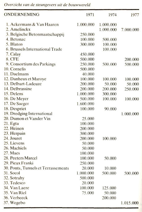 Verklaring bij de tabel 1. Ackermans & Van Haaren Antwerpse holding. In '74 fusioneerde de baggerafdeling van Ackermans & Van Haaren met de Algemene Baggermaatschappij, een dochter van CFE, de nummer 8 in de tabel. Uit die fusie ontstond Dredging International, de nummer 19. 2,2% van de aandelen van Ackermans & Van Haaren is in handen van Royale Beige, nog een financier van de CVP. 2. Amelinckx Grootste Belgische appartementenbouwer. Verkeert sinds de beginjaren '80 in een diepe krisis. Amelinckx wordt geleid door Renaat Blijweert, een vriend van adjunkt-schatbewaarder August Cool. De 7 miljoen van '77 werd opgedeeld in: 3 miljoen voor de nationale kas van de CVP-PSC, 2 miljoen voor de kas van ACW en 2 miljoen voor Alfred Califice, MOC-er en voorheen minister van Openbare Werken. 3. Belgische Betonmaatschappij (SBBM) De Société Générale des Bétons - Belgische BetonMaatschappij staat 10de gerangschikt in de top van de bouwbedrijven. Kon-taktpersoon tussen SBBM en Raymond Scheyven was Charles-Marie Stulemeijer, afgevaardigd-beheerder van SBBM. De tweede afgevaardigd-beheerder is Jean Tytgadt. Beide heren werden in '79 ingeschakeld om de met failliet bedreigde onderneming Socol (de nummer 31) te redden. SBBM staat bekend als een welgeziene maatschappij in CVP-PSC-kringen. 4. Betonac Limburgse maatschappij die 8ste gerangschikt staat in de top van de bouwbedrijven. Afgevaardigd-beheerder en kontaktpersoon voor de CVP was Maxime Cuyck, een vriend van Jos De Saeger. Vanaf het ogenblik dat De Saeger minister van Openbare Werken werd, schoot het omzetcijfer van Betonac de hoogte in: in 1960 was dat zakencijfer 1,5 miljoen, in 1971 was dat al 1,2 miljard. Het overgrote deel van het j aarli j kse omzetcij f er werd gere-alizeerd via overheidskontrakten ondertekend door De Saeger. 5. Blaton Bedoeld is Adolphe Blaton, bouwpromotor en één van de cen-(i ;ile figuren in de groep rond Charlie De Pauw, stuwende kracht lichter Consortium des Parkings, de nummer 9 in de tabel. 8. CFE De nummer één in de Belgische bouwwereld. Dochter van de So-ciété Générale. In 1980 slokte CFE de nummer twee in de bouwwereld, Francois, op. 9. Consortium des Parkings Eén van de maatschappijen van de Brusselse promotor Charlie De Pauw, gangmaker van het World Trade Center. 75. Delens (Maurice) Vijftiende grootste bouwonderneming. In 1978 schreef Ray-mond Scheyven de initialen VDB achter de naam van Delens. Daarmee bedoelde hij dat Guy Delens, de voorzitter-afgevaardigd-beheerder beslist had zijn financiële steun op Paul Vanden Boeynants te koncentreren. Delens nam in '80 de kontrole over de bouwonderneming Verbeeck, de nummer 36 in de tabel. 16.L.L. &N. De Meyer Leider van de tijdelijke vereniging Zeebouw-Zeeland die de haven van Zeebrugge uitbouwt. Financiële steun van De Meyer aan de CVP-PSC liep langs Louis De Meyer, direkteur-generaal. Deze staat in het Gentse bekend als een vriend des huizes bij Willy De Clercq, de vroegere PVV-voorzitter. 17. De Saeger Bedoeld is de steun van diverse bouwmaatschappijen die via minister van Openbare Werken Jos De Saeger in de partijkas terecht kwam. 19. Dredging International Grootste Belgische baggeraar, derde grootste Belgische bouwonderneming. De Société Générale kontroleert, via haar dochter CFE, Dredging voor 44%. Steun liep via Paul Van Haaren, afgevaardigd-beheerder en Philippe Caeymaex, beheerder-direkteur en lid van het uitvoerend komitee. Caeymaex was één van de genodigden op de Flandria-boottocht van P.W. Segers. 23. Pieux Franki Tweede grootste bouwonderneming. Gekontroleerd door de familie Nagelmackers en via de twee dochters Sibeka en UFI door de Société Générale. De financiële steun liep langs Urbain Smet, afgevaardigd-beheerder. 31. Socol Financiële steun voor de CVP-PSC via Xavier Scheyven, beheerder en neef van Raymond Scheyven. Socol was een dochter van de holding Socfin, nog een financier van de CVP-PSC-kiescampagnes. Socol bouwde onder meer de zetel van De Volksverzekering in Brussel. De onderneming werkte nauw samen met M+R wat zoveel wil zeggen als "Mens en Ruimte", een studiebureau van de groep rond de CVP-eminenties Renaat Van Elslande en Frans Van Mechelen. In januari '80 ging Socol failliet. In mei '79 was er een onderzoek van het parket geweest naar fraude, valsheid in geschrifte, valsheid in balansen en erg wazige financiële transakties tussen de Brusselse hoofdzetel en het Socol-filiaal in Nigeria. 34. Van Laere Kontaktpersoon van Raymond Scheyven was Hendrik Steegmans, zaakvoerder. 36. Verbeeck In '73 lekte uit dat Fons Verbeeck, de intussen overleden leider van de onderneming, bij de parlementsverkiezingen van '68 via De Saeger, de CVP-kas gespekt had.Toen Verbeeck in '80 overgenomen werd door Delens (nummer 15 in de tabel), werd Ver-tonghen financieel-direkteur bij CFE (de nummer 8). Van de top 10 in de Belgische bouwwereld zijn de nummers 1 (CFE), 2 (Franki), 3 (Dredging International), 8 (Betonac) en 10 (SBBM) financiers van de nationale CVP-PSC-kas. De nummer 1 is een dochter van de Société Générale. De nummer 2 wordt voor 25% en de nummer 3 voor 44% gekontroleerd door de Société Générale. De katolieke kerk: zwart geld naar de CVP - Inhoud De katolieke kerk: zwart geld naar de CVP Voor de financiering van haar kiespropaganda weet de CVP ook in de geldbeugel van de katolieke kerk te tasten. Enige precizering is hier allicht gewenst: het gaat om geld beheerd door de hoogwaardigheidsbekleders van de kerk. De gelovigen zelf worden in de onwetendheid gelaten van het feit dat gelden, voor religieuze doeleinden vergaard, diskreet afgevoerd worden naar een partij waar bankiers en industriemagnaten de plak zwaaien. Overzicht van de financiële steun vanuit de katolieke kerk