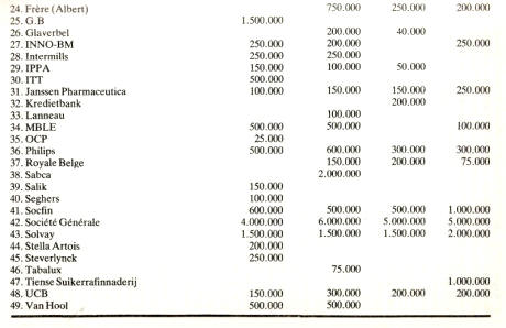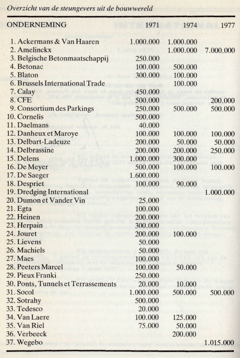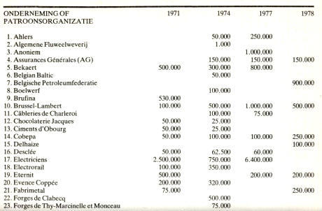 Overzicht steungevers - Inhoud Volgende tabel geeft een overzicht van de steun van de verschillende ondernemingen. De giften van bouwmaatschappijen zijn niet in deze tabel opgenomen. Die worden verderop behandeld. De lezer dient er rekening mee te houden dat het hier enkel gaat om giften op nationaal vlak. Vele van deze ondernemingen steunen daarbuiten nog plaatselijke politici. Tenzij in de daarna volgende 'Verklaring bij de tabel' uitdrukkelijk anders vermeld, gaat het hier dus enkel om financiële steun aan de nationale kas van CVP en PSC. Verklaring bij de tabel 1. Ahlers Op het einde van de jaren '70 had Ibel 23% van de Ahlers-aandelen in handen. Ibel is de Vlaamse dochterholding van Cobepa, de nummer 14 in de tabel. Ibel heeft eveneens 20% van de aandelen van de Vlaamse Uitgeversmaatschappij (V.U.M.) die de Alles-Voor-Vlaanderen-Vlaanderen-Voor-Kristus-krant De Standaard uitgeeft. De grootste aandeelhouder van Ahlers is de Duitse groep Stin-nes. Deze groep is een dochter van VEBA, een Duitse staatsholding. De steun van Ahlers aan de CVP-PSC liep via André Leysen. Hij was in '77 voorzitter van Ahlers. Leysen was vanaf '73 beheerder en vanaf '74 lid van het direktiekomitee van Cobepa. Tot '78 was hij afgevaardigd-beheerder van Ibel. Hij leidde die holding samen met Fernand Nédée de adjunkt-schatbewaarder van de CVP-PSC. André Leysen begon zijn opgang binnen de Vlaamse kapitalistenklasse door zijn huwelijk in '51 met een dochter van de scheepsagent Ahlers. Hij bouwde Ahlers uit tot een rederij. Toen in '70 de groep Stinnes de kontrole nam over Ahlers, trok Leysen naar Ibel. Via Ibel kwam hij bij Gevaert Photo Producten terecht. In '84 volgde Leysen Daniel Janssen op als voorzitter van het Verbond van Belgische Ondernemingen (VBO). Leysen is beheerder van het Verbond van Kristelijke Werkgevers (VKW) en censor van de Nationale Bank. Hij werd door P. W. Segers uitgenodigd om de Flandriaboottocht mee te maken. 4. Assurances Générales, A.G. A.G. is de eerste verzekeringsgroep van het land. A.G. wordt ge-kontroleerd door de families Lippens, Solvay, de Marnix, de Jonghe d'Ardoye e.a. In '83 werd jonkheer Maurice Lippens de afgevaardigd-beheerder van A.G. Hij is de broer van de CVP-burgemeester van Knokke-Heist, Leopold Lippens. De familie Lippens is gelieerd met het Belgische vorstenhuis en behoort samen met de meeste andere families die A.G. kontroleren tot de aandeelhouderskring van de Société Générale. De relatie tussen A.G. en de CVP liep in de jaren '70 voornamelijk - ten minste voor wat betreft de financiële steun - via burggraaf Charles de Jonghe d'Ardoye. Hij was toen voorzitterafgevaardigd-beheerder van A.G. Charles de Jonghe d'Ardoye is 25 jaar lang kommissaris geweest van de Société Générale. Een ander lid van de familie de Jonghe d'Ardoye, gravin Elisabeth, trouwde met burggraaf Roger de Spoelbergh. Elisabeth de Jonghe d'Ardoye was CVP-burgemeester van Londerzeel van '47 tot '64. Roger de Spoelbergh kwam uit een familie die de belangrijkste aandeelhouder is van de eerste brouwerij van het land, Stella Artois, de nummer 44 in de tabel. 5. Bekaert Grootste draadtrekkerij ter wereld. De Bekaertgroep bestaat uit 42 industriële vestigingen in 14 landen, geassocieerde ondernemingen meegerekend. De onderneming is in handen van de familie van Leon Bekaert, de belangrijkste patroonsleider van na de oorlog. Voorzitter van Bekaert is baron Antoine Bekaert, de zoon van Leon. Antoine Bekaert is vice-voorzitter van de afdeling West-Vlaanderen van Fabrimetal, de patroonsorganizatie in de metaalsektor. Hij is eveneens voorzitter van UNIAPAC-Europa en vice-voorzitter van UNIAPAC-Internationaal. UNIAPAC is de katolieke patroonsorganizatie die in '50 in Rome gesticht werd. Afgevaardigd-beheerder van Bekaert is Jean-Charles Velge. Hij is getrouwd met een dochter van baron Jean van Houtte, de vroegere CVP-premier. 7. Belgische Petroleumfederatie In '71, '74 en '77 had Raymond Scheyven Paul Hatry, de afgevaardigd-beheerder van de Belgische Petroleumfederatie financiële steun gevraagd. Pas in '78 wilde de liberaal Hatry effektief met geld over de brug komen. 8. Boelwerf De kontaktpersonen van Raymond Scheyven en Fernand Nédée op de Boelwerf waren Jacques Van Damme en Philippe Saverys. Dat zijn twee kopstukken van de groep Boel-Van Damme. Al-mabo, de holding van deze groep, kontroleert de Boelwerf in Temse, de Scheepswerven van Langerbrugge, de verzekeringsmaatschappij Mercator... Almabo heeft een minderheidspartici-patie in C.M.B., de zeevaartmaatschappij die door de Société Générale gekontroleerd wordt. De familie Boel-Van Damme en de Société Générale oefenen samen nagenoeg een monopoliepositie uit in de scheepsbouw en de scheepsherstelling. Die samenwerking is ook merkbaar in de beheerdersmandaten: van de maatschappij Mercantile Beliard, de scheepsherstellingsmaatschappij die uit de fusie van Mercantile en Beliard Murdoch ontstond, is Philippe Saverys beheerder en André Dubuisson van de Société Générale voorzitter. Saverys is eveneens beheerder van C.M.B, en van F.N. in Herstal, twee dochters van de Société Générale. Hij is ook, zoals André Leysen, beheerder van de Vlaamse Uitgeversmaatschappij. 9. Brufina en 10. Brussel Lambert In '72 fusioneerden de holdings Brufina, Cofinindus en Cofinter van de Groep Brussel rond graaf Jean-Jacques de Launoit met de Compagnie Lambert rond baron Léon Lambert. Zo ontstond één van de belangrijkste holdings van het land, de Groep Brussel Lambert. In '81 werd André Dequae, de voormalige CVP-minis-ter van Financiën, voorzitter van de Kredietbank-holding Al-manij en voorzitter van de Boerenbond, de nieuwe voorzitter van de Bank Brussel Lambert. In '82 nam een konsortium onder leiding van Albert Frère (de nummer 24 in de tabel) de kontrole van de Groep Brussel Lambert. Dat konsortium bestond uit Etablis-sements Frère-Bourgeois, de Zwitserse holding Pargesa waarvan Frère afgevaardigd-beheerder is, de holding Cobepa waarvan Fr