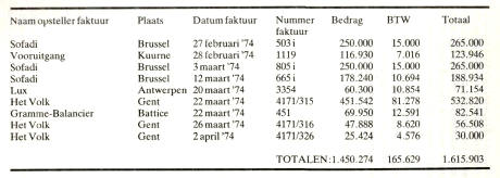 Daarnaast werd naar hartelust gebruik gemaakt van het systeem van valse fakturen. Het mekanisme werkt als volgt: CVP-kandidaten die naar de gunst van de kiezer dongen, lieten hun propagandamateriaal bij voorkeur drukken bij Sofadi, Lux of andere CVP-bevriende drukkerijen. Deze drukkerijen maakten fakturen op, niet op naam van de CVP-kandidaten die het propagandamateriaal besteld hadden maar op naam van de bouwonderneming Amelinckx. Omdat in verkiezingsperiodes de drukkerijen en de uitgeverijen van de CVP het werk niet gedaan kregen, zochten de kandidaten drukkerijen in hun streek op en lieten daar hun folders drukken. Aan die drukkerijen vroegen ze fak-tuur op te stellen niet op hun naam maar op naam van ondernemingen als bijvoorbeeld Amelinckx. Zo komt het dat Amelinckx tussen 27 februari '74 en 2 april '74 niet minder dan 9 dergelijke fakturen in de bus kreeg. Alle betreffende fakturen dragen de verantwoording 'rekening voor administratieve papieren' of 'publiciteitsfolders' of 'reclamecampagne'.. . Het lijstje van deze 9 fakturen is (de BTW-voet is 6% of 18%, naargelang het gaat om 'folders' of 'advertenties'): (zie tabel op volgende bladzijde). De belangrijkste faktuur uit dit lijstje is deze van de drukkerij Het Volk van 22 maart '74. Die faktuur is hierbij afgedrukt. Het Volk geeft als verantwoording voor de faktuur: 'Reclamecampagne 'appartementen' tijdens de maanden januari en februari, volgens overeenkomst.' In werkelijkheid is het de faktuur voor verkiezingsdrukwerken voor mensen als Wilfried Martens, Da-niel Coens, Marcel Vandewiele, Edward Leemans, Jan Verroken, Marcel Van der Aa, Omer De Mey... Het Volk is zo vriendelijk geweest een overzicht van deze verkiezingsdrukwerken op papier te zetten. Dat dokument is hier eveneens afgedrukt. Het totaal van het lijstje van 9 fakturen is 1.615.903 frank, 165.629 frank BTW inbegrepen. De firma Amelinckx kon door dit mekanisme een deel van het geld dat zij aan de CVP-kiescampagne besteedde, via de BTW rekupereren. August Cool had het sommetje van 165.629 frank ook gemaakt en vervolgens Renaat Blijweert, de afgevaardigd-beheerder van Amelinckx gevraagd de BTW te storten op rekening 799-5500392-09 van de BAC op naam van 'Cool en Cie, Wetstraat 135 in Brussel'. Zo kwam ten slotte ook de BTW in de verkiezingskas terecht!